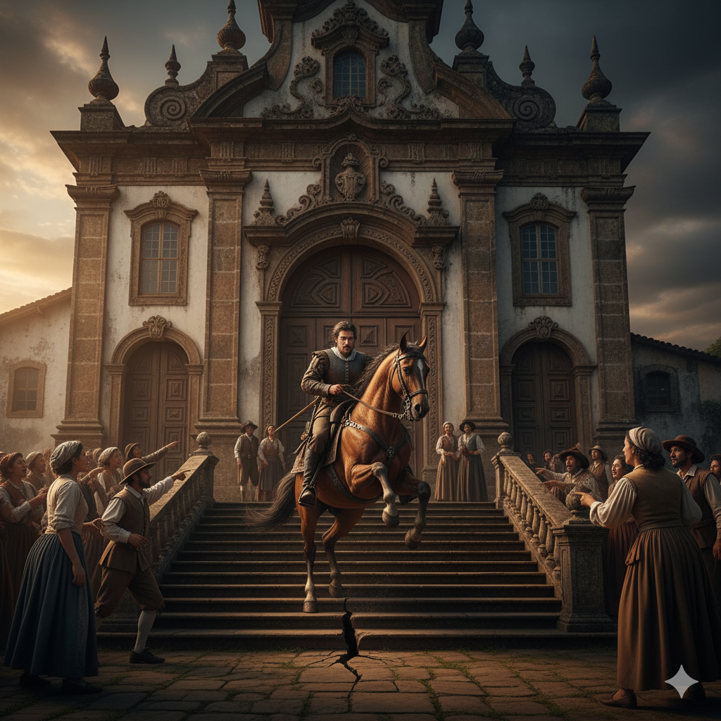 Em meados do século XVII, um cavaleiro vindo de Cuiabá, a caminho de Minas Gerais, passou pela região de Aparecida. Ao ver a profunda fé dos romeiros, o homem começou a zombar abertamente, descrevendo a devoção como “bobagem” e tolice. Em um ato de suprema blasfêmia e para provar seu desprezo, ele decidiu ir além: tentou entrar na igreja montado em seu cavalo, visando profanar o templo e atingir a Imagem.