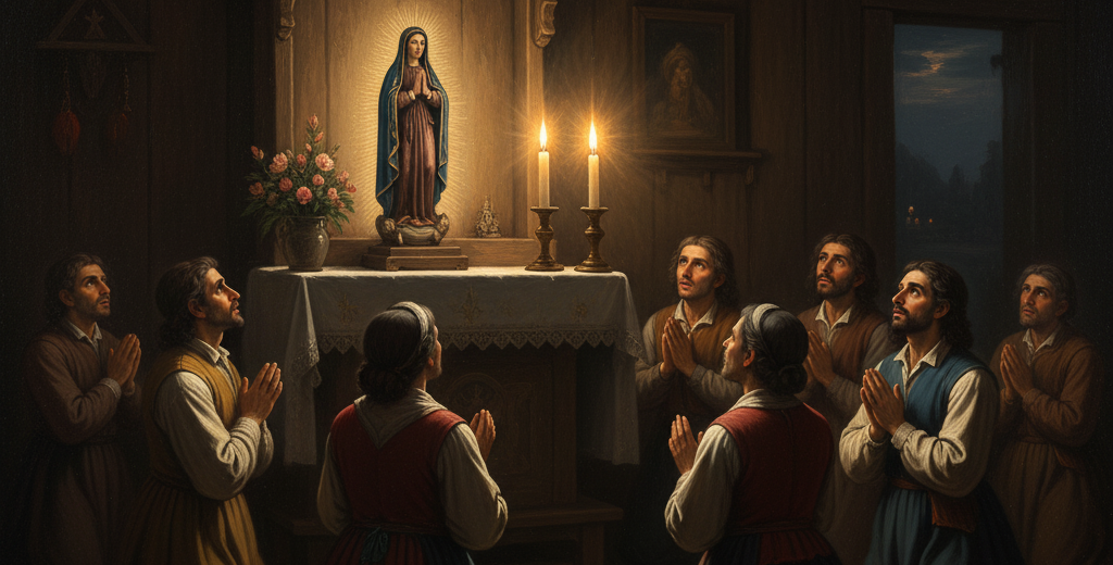 No modesto oratório erguido em Itaguaçu, onde a pequena Imagem fora colocada, os fiéis se reuniam para a oração e para acender velas em honra à Virgem. Era um momento de recolhimento e fervor. A tradição narra que, em uma noite serena, durante um desses momentos de devoção, as duas velas que iluminavam a Sagrada Imagem repentinamente se apagaram, mergulhando o local na escuridão.