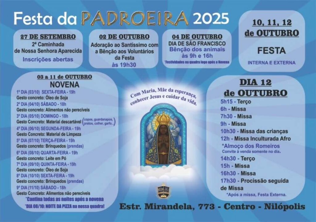 A Paróquia Nossa Senhora Aparecida, em Nilópolis, convida toda a comunidade e região para a Festa da Padroeira 2025, um evento especial que une a devoção religiosa à união comunitária e ações de solidariedade. A celebração, que acontece de 3 a 12 de outubro, tem como tema “Com Maria, Mãe da Esperança, conhecer Jesus e cuidar da vida”. A programação inclui a tradicional novena, missas especiais e eventos sociais que fortalecem a fé e o cuidado com o próximo.