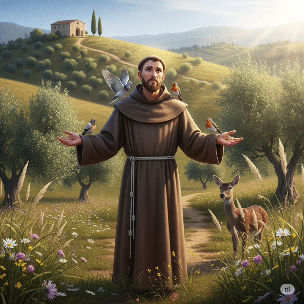 Imagine a Assis do século XII, uma cidade movimentada na Itália, cheia de nobres, mercadores e gente sonhadora. Nesse cenário, o jovem Francisco Bernardone se destacava. Filho de um rico comerciante de tecidos, ele tinha a vida que muitos sonhavam: dinheiro para festas, roupas de luxo, serenatas, e a fama de ser o “rei da juventude”. Francisco era popular, alegre e ambicioso, sonhando em se tornar um cavaleiro e conquistar glória e nobreza nas batalhas da época.