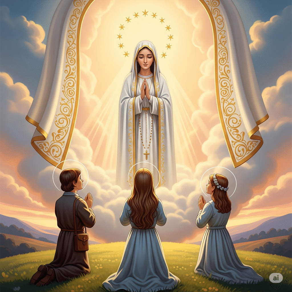 No dia 13 de maio de 1917, na cidade de Fatima, Portugal, Lucia, Jacinta e Francisco brincavam na Cova da Iria. Neste lugar, apareceu-lhes a Mae de Deus. “Era uma Senhora mais brilhante que o sol, vestida toda de branco, espargindo luz mais clara e intensa que um copo de cristal, cheio de agua cristalina, atravessado pelos raios do sol mais ardentes, e a face indescritivelmente bela, com ar de suave censura”, descrevia Irma Lucia.